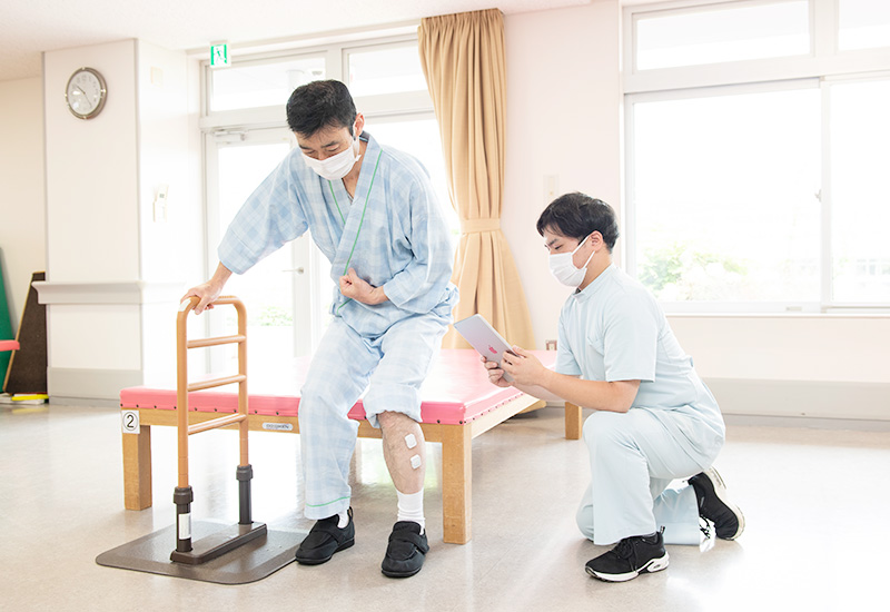 入院診療〜老人保健施設〜自宅生活において、理学療法・作業療法・言語聴覚療法によるリハビリを実施。多職種が連携し、在宅復帰や生活機能の回復をしっかりとサポートしています。回復期リハビリ病棟では集中的なリハビリを行っています。