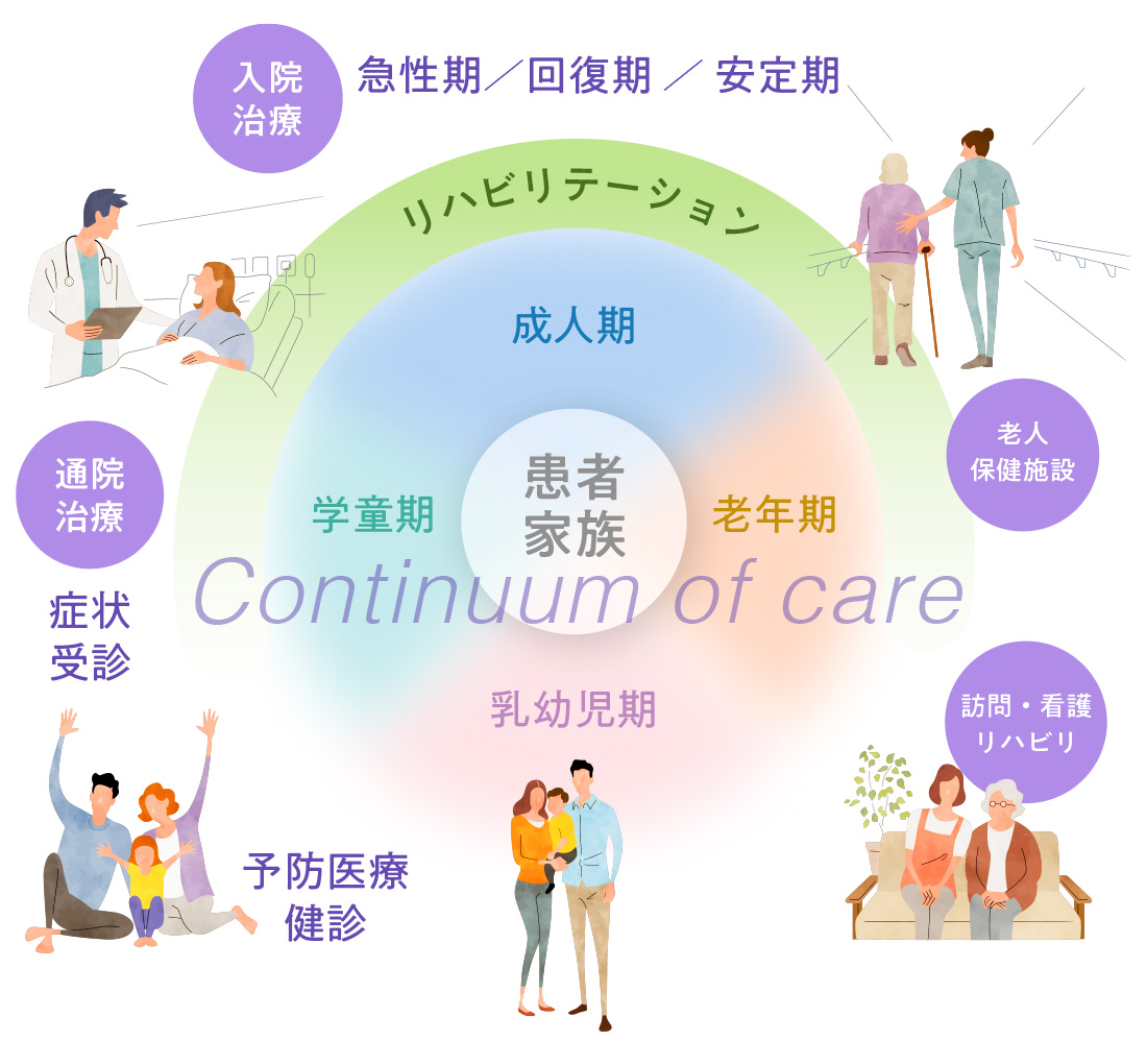 1959年の開設以来、医療・介護・福祉の機能を融合させた包括的な体制を構築。訪問看護・訪問リハビリや介護施設との連携を通じて、地域の皆さまが安心して暮らせる環境づくりに貢献しています。