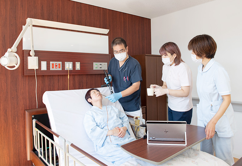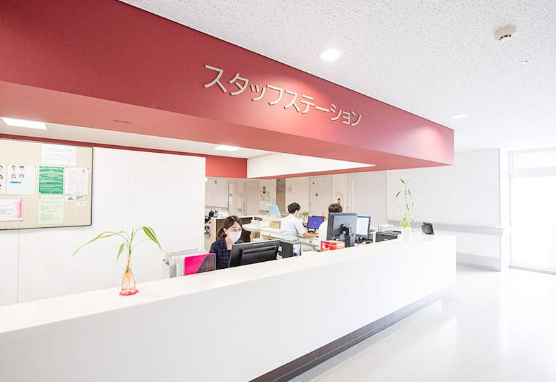 2階病棟は、一般病床22床、地域包括ケア病床20床の42床の病棟です。看護師配置は10対1です。多様かつ複雑な患者さまの医療・生活ニーズに寄り添い、多職種と連携しながら患者さまのケアを中心的に担うとともに家族に向けた支援を行っています。