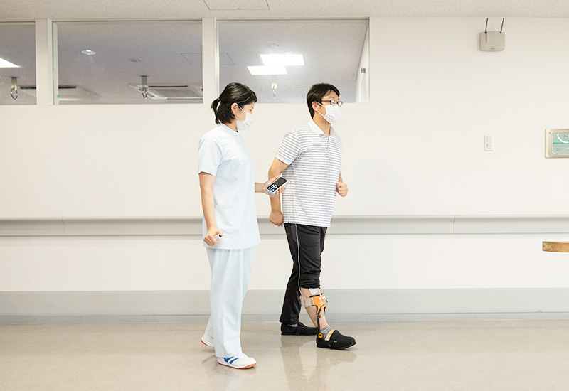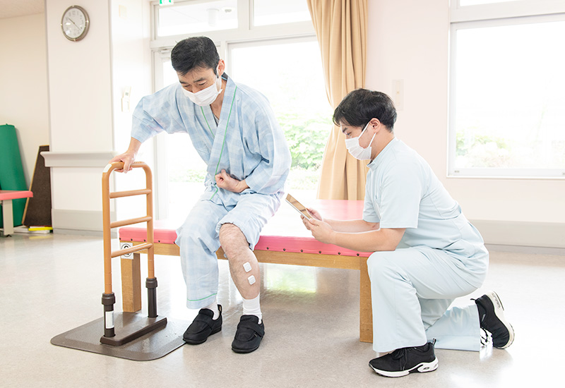 病気やケガによって動作が困難となった場合でも、お一人おひとりの状況や必要性に応じて、少しずつできることを増やしていけるよう支援します。療法室での基礎的なリハビリに加えて、病棟での生活のなかでも「自分でできることは自分で行う」ことを大切にし、スタッフがサポートします。