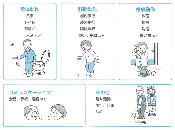 回復期リハビリテーション病棟で目標とする「日常生活動作」は、上記のようなものです。