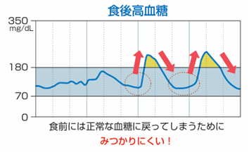 皆さん、健診は受診されていますか?健診で血糖を気にされている方は多いのではないでしょうか。健診は空腹時血糖(10時間以上食事を取らない状態で測定した血糖値のこと)の測定となっていますが、空腹時血糖が110mg/dl未満であれば正常と判定されています。空腹時血糖が大丈夫だから、自分の血糖値は大丈夫と思われるかもしれませんが、落とし穴があるかもしれません。
