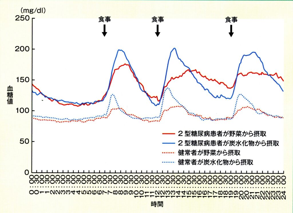 よく聞かれることだと思います。実際にデータで見てみましょう。これは糖尿病患者さんおよび、血糖正常者を対象に食事を野菜→タンパク質→炭水化物の順に摂取した人、炭水化物→タンパク質→野菜の順に摂取した日の血糖変動の違いを調べた物になります。同じ方が同じ栄養を摂取しても、食べる順序によって大きく血糖値が異なり、野菜を最初に炭水化物を最後に摂取するだけで食後血糖値が抑えられ、血糖変動も約30%減少したことを示しています。