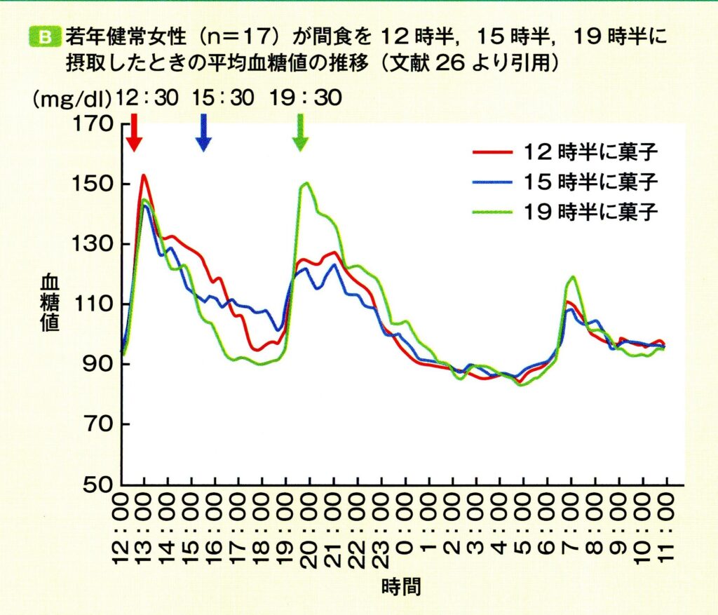 • 食事をしっかりとっているけれど、おやつを食べたい時、時間を工夫してみましょう。これは、若年健康女性が完食を12時30分、15時30分、19時30分に接種したときの血糖値の推移を示した物になります。昼食直後の12時30分、夕食直後の19時30分におやつを食べた場合は、血糖上昇を認めていますが、15時30分に食べたときは食後血糖の上昇が、その他の時間よりも緩やかになっているのが見られます。どうしてもおやつを食べたい時、3時のおやつは理にかなっているかもしれません。
