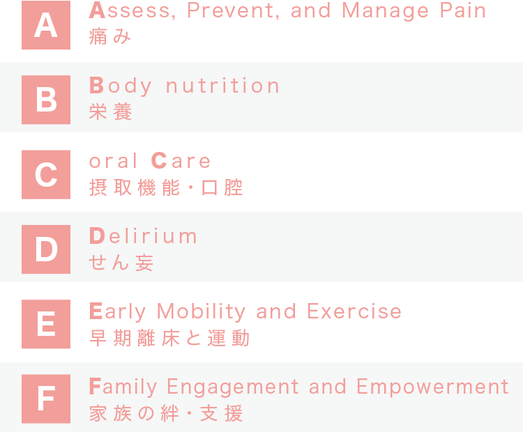 竹重病院では入院した患者さまにバンドル管理を取り入れています。バンドル(束:Bundle)とは科学的に有効性のあるいくつかの介入方法を単独ではなくまとめて行うことで高い効果を得ようとする方法です。特定の病気に向けたものではなく、すべての患者さまにあてはまることを項目にしています。患者さま・ご家族さまを中心に、入院中だけではなく、退院後の生活にも継続していけるように多職種が取り組んでいます。